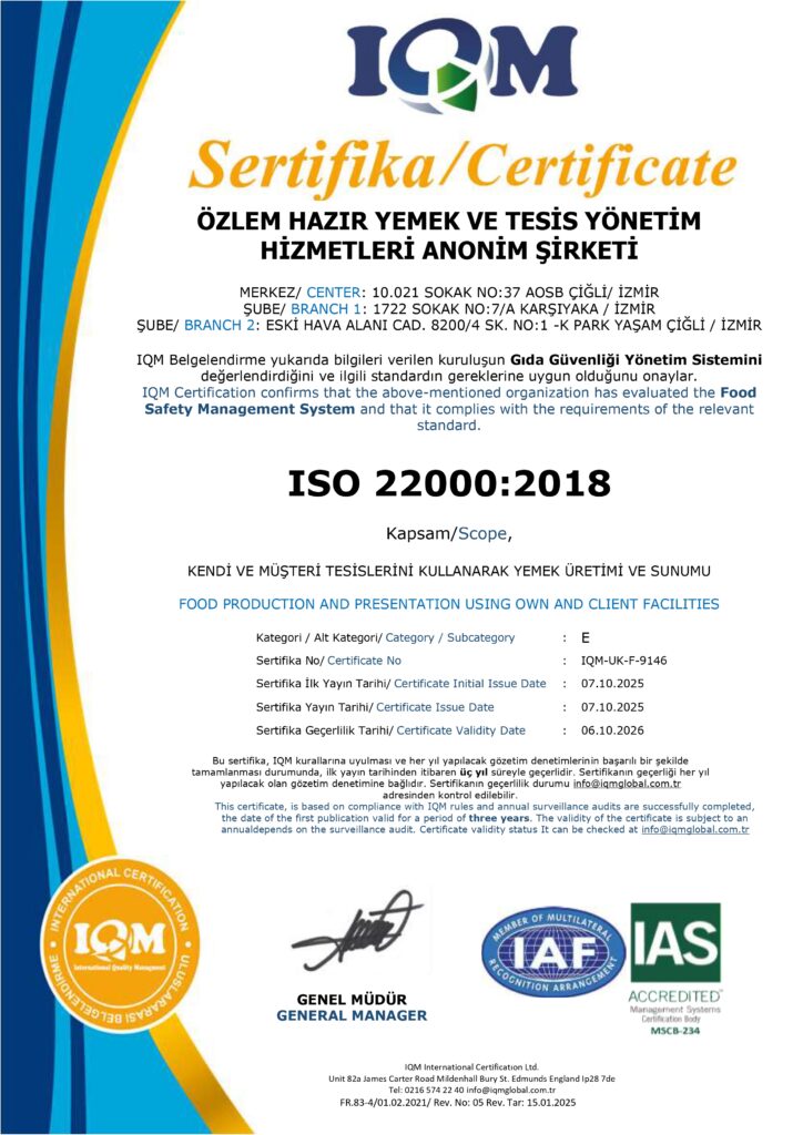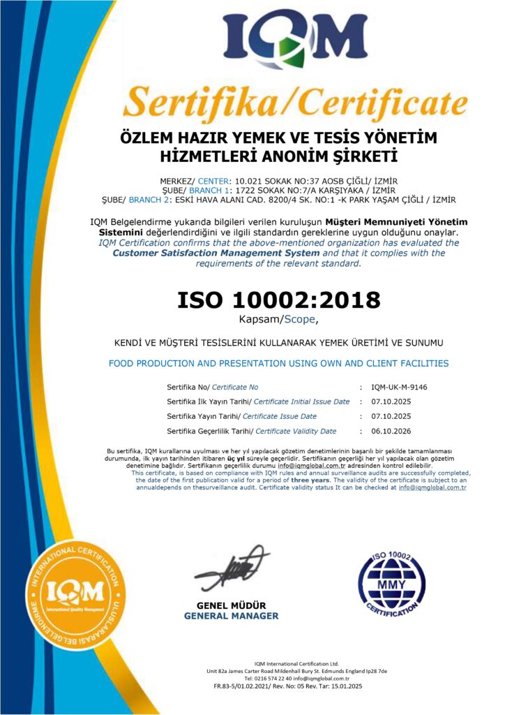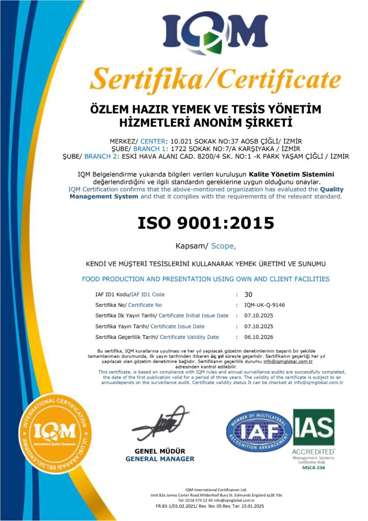 Özlem Group olarak, sunduğumuz tüm hizmetlerde lezzetin yanı sıra hijyen, kalite ve güven ilkelerini temel önceliğimiz olarak görüyoruz. Faaliyet gösterdiğimiz her alanda; yasal mevzuatlara, ulusal ve uluslararası kalite standartlarına uygun şekilde üretim ve hizmet sunmayı taahhüt ediyoruz.